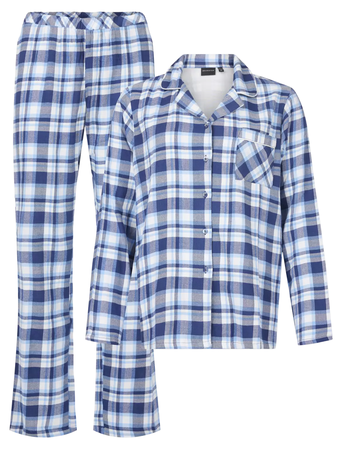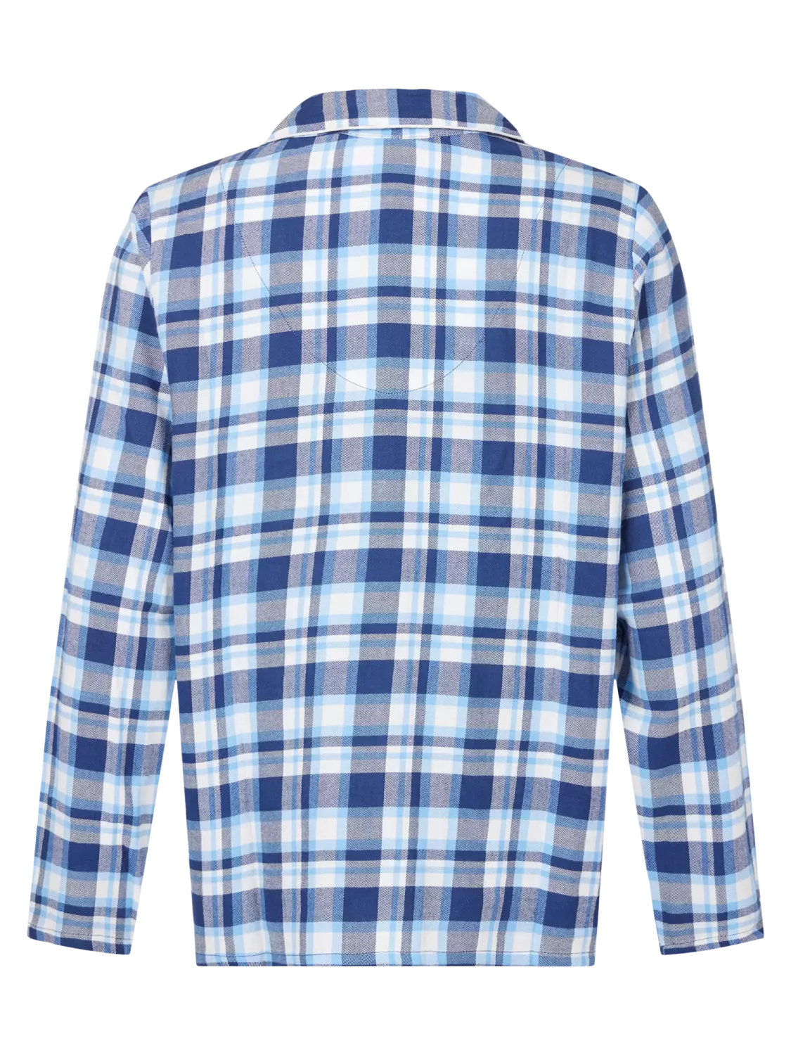 Klassisk pysjamasett fra Brandtex i myk flanellkvalitet. Skjorten har et tidløst rutemønster i blå og hvite nyanser, knappelukking foran og en brystlomme.